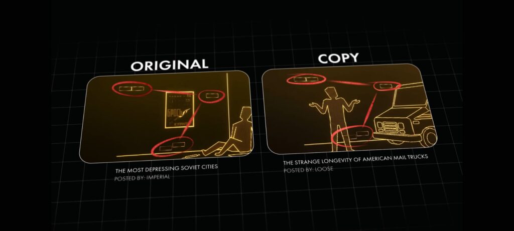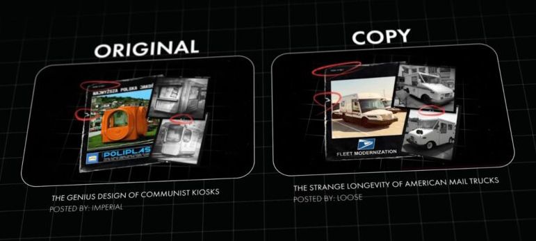 • In one scene, the original video showed a communist kiosk on a table. The stolen version replaced the kiosk with a mail truck. The dark splotches on the table, the floor texture, the lighting, and the overall layout stayed exactly the same.